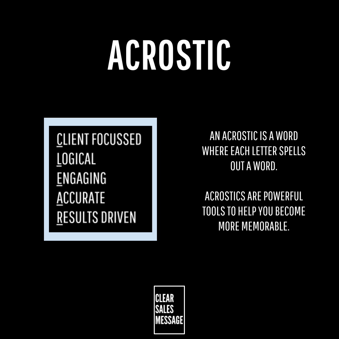 Being memorable is a fundamental issue in sales messaging. Acrostics allow lots of information to be collated together and recalled logically and sequentially. It also allows the same message to be recalled every time with little to no divergence