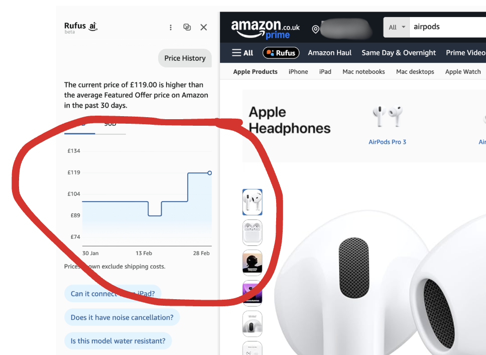 Pricing on Amazon is rarely a round number. Their unique “price history” function allows you to see previous prices for products – these Airpods have been
