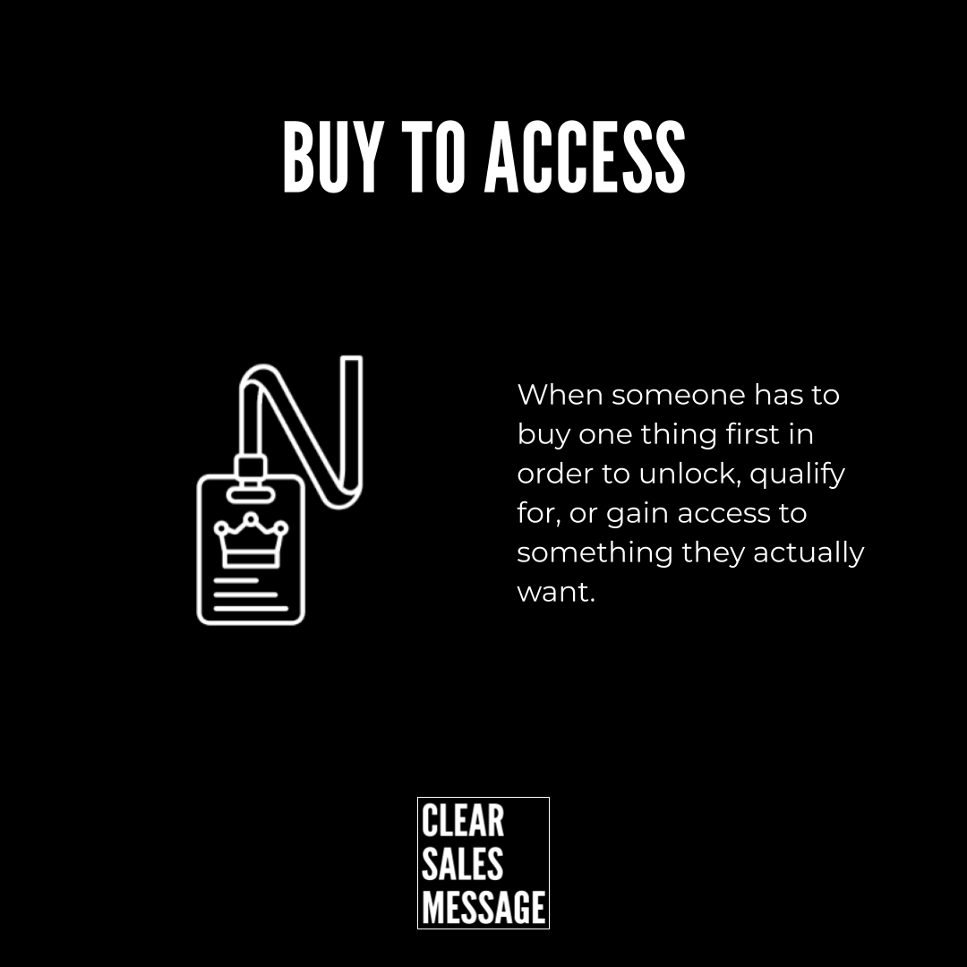 Buy to access is when someone has to purchase one thing in order to unlock, qualify for, or gain access to something else they actually want.