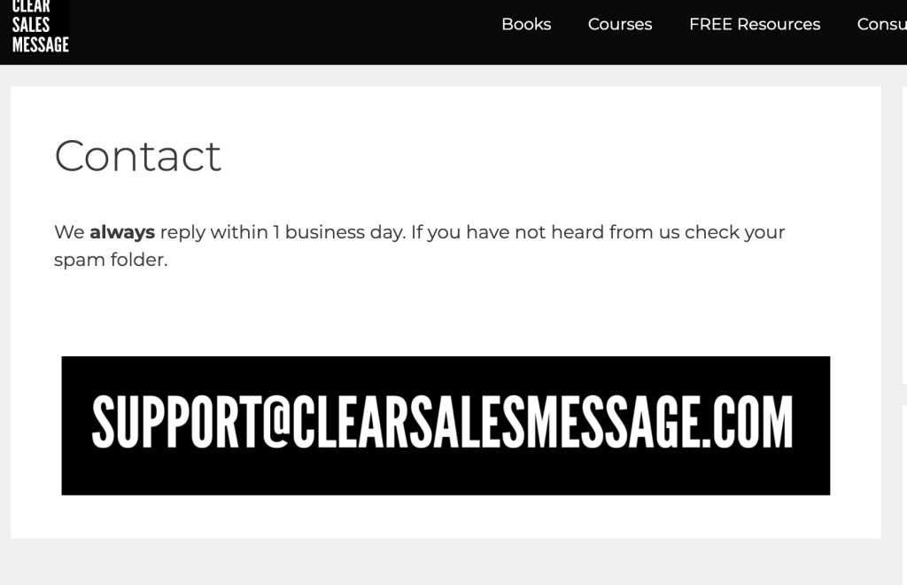 The Clear Sales Message™ website uses an image of the contact email rather than the text.