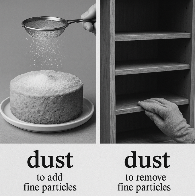 To dust a shelf means to remove a fine layer of dirt.