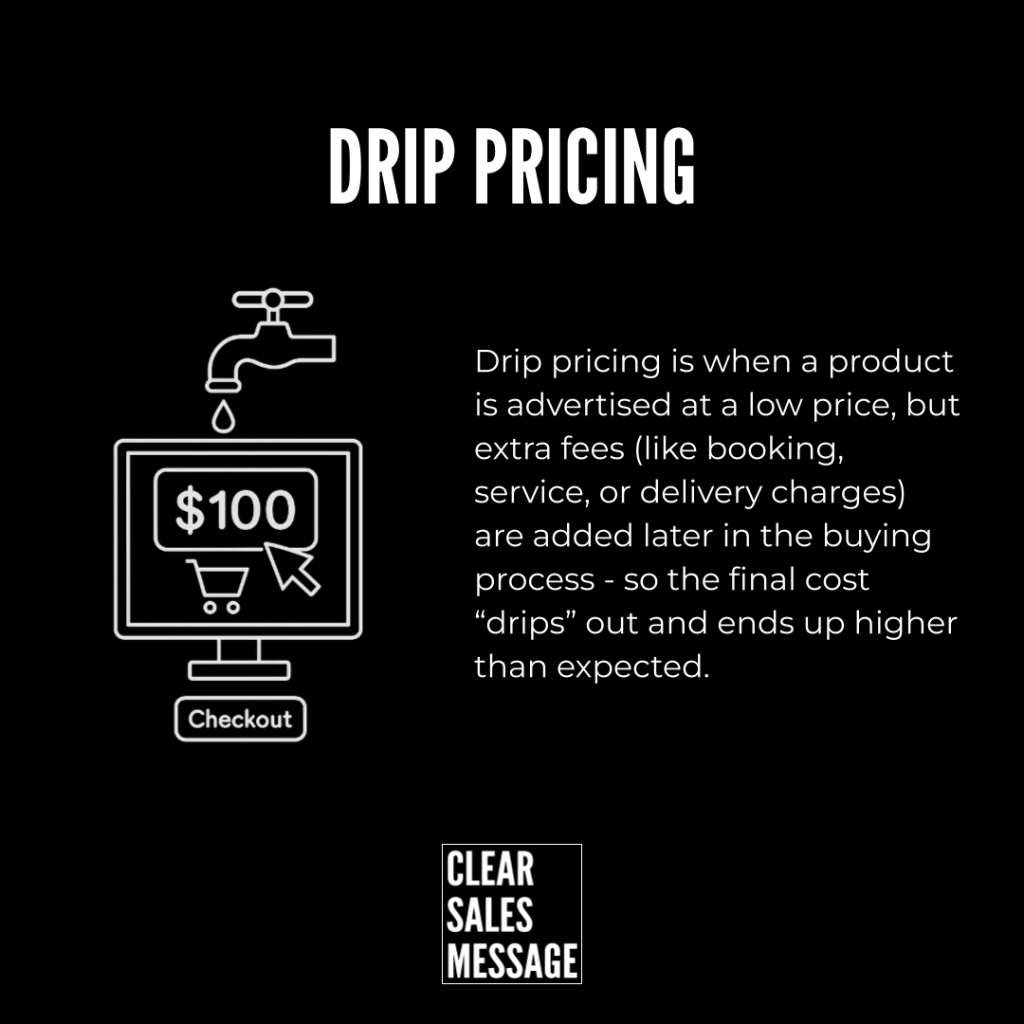 Drip pricing is a pricing tactic where the full cost of a product or service is revealed bit by bit throughout the buying journey, rather than being shown upfront. Initially, the customer sees an attractive base price, but as they progress toward checkout, extra fees, taxes, or charges are added.