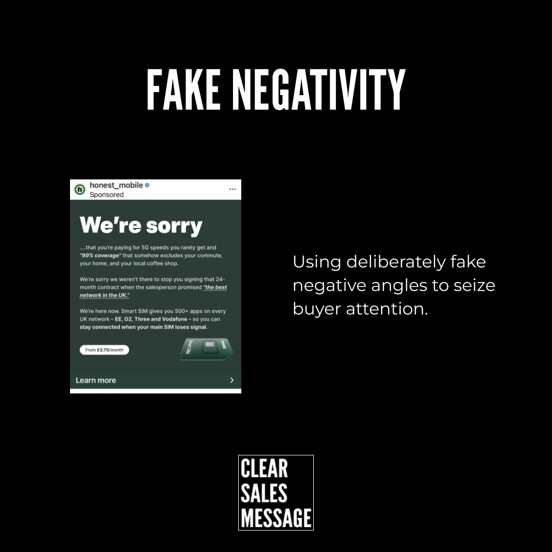 Fake negativity is a marketing tactic that uses attention-grabbing negative statements that aren’t actually bad news. It’s the “We’re sorry…” or “We failed you…” approach that instantly hooks the reader because it sounds like an apology, mistake, or problem, but quickly flips to reveal a positive message. It works because people are naturally drawn to potential conflict or drama. The twist is that the negativity isn’t real, it’s just a clever setup to make the positive message hit harder.