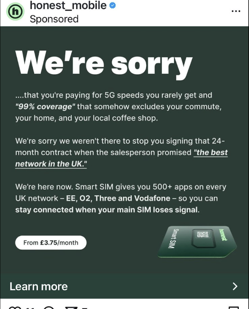 This phone company use “I’m sorry” in big letters to seize your attention.. to then apologise on behalf of their crappy competition.