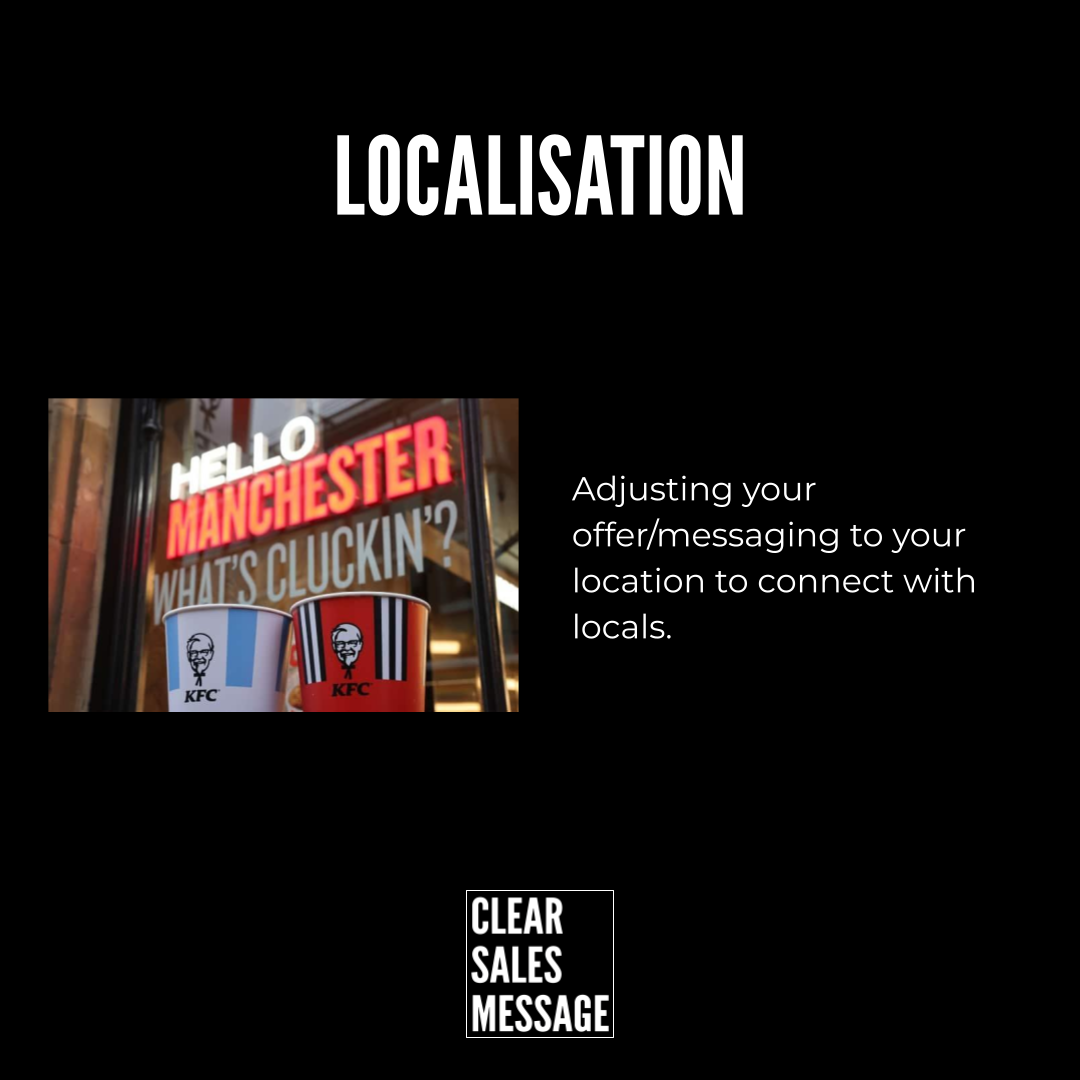 You can use the Localisation Effect by adding subtle and thoughtful references to your location in your marketing, signage, offers, or campaigns. It can be as simple as greeting the city by name, using a well known local phrase, highlighting a local landmark, or acknowledging something the community is proud of. You can add localisation to emails, landing pages, adverts, outdoor signage, or even your sales conversations. The goal is to create a moment of recognition that makes the buyer feel like you understand their world. When people feel that connection, they are far more likely to notice you, trust you, and take the next step.