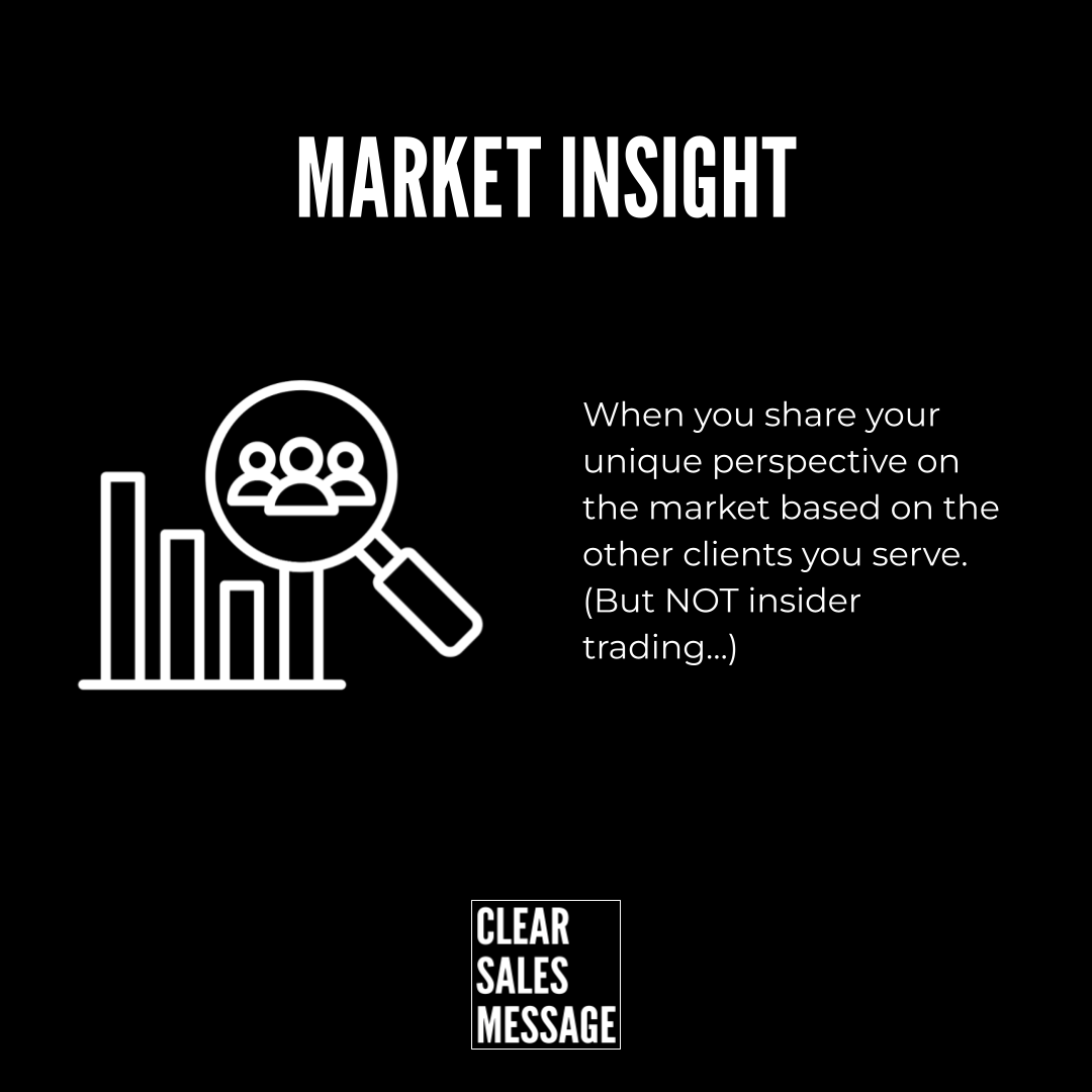 Market insight is when you share what you are seeing in the marketplace from your own unique perspective. It is not about leaking confidential or insider information, it is about spotting patterns, trends, and shifts that others might not have noticed yet. You become the lens that helps clients see what is really going on, what is changing, what is working, and what is coming next. Good market insight makes your audience feel informed, prepared, and confident in your expertise.