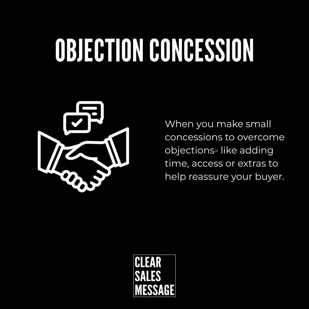 An objection concession is when you make small, thoughtful compromises to overcome buyer resistance. Instead of lowering your price, you offer something extra that adds reassurance or perceived value. It could be more time, more access, an additional feature, or a bonus resource that makes the buyer feel they are getting more without you giving too much away. The goal is to keep the deal moving forward while maintaining the integrity of your pricing and positioning.