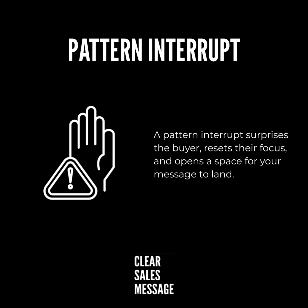 A pattern interrupt is any unexpected action, word, or moment that stops the usual flow of a sales interaction. It could be spoken, written, visual, or even physical. The goal is to break auto-pilot and bring the buyer’s attention back to you.