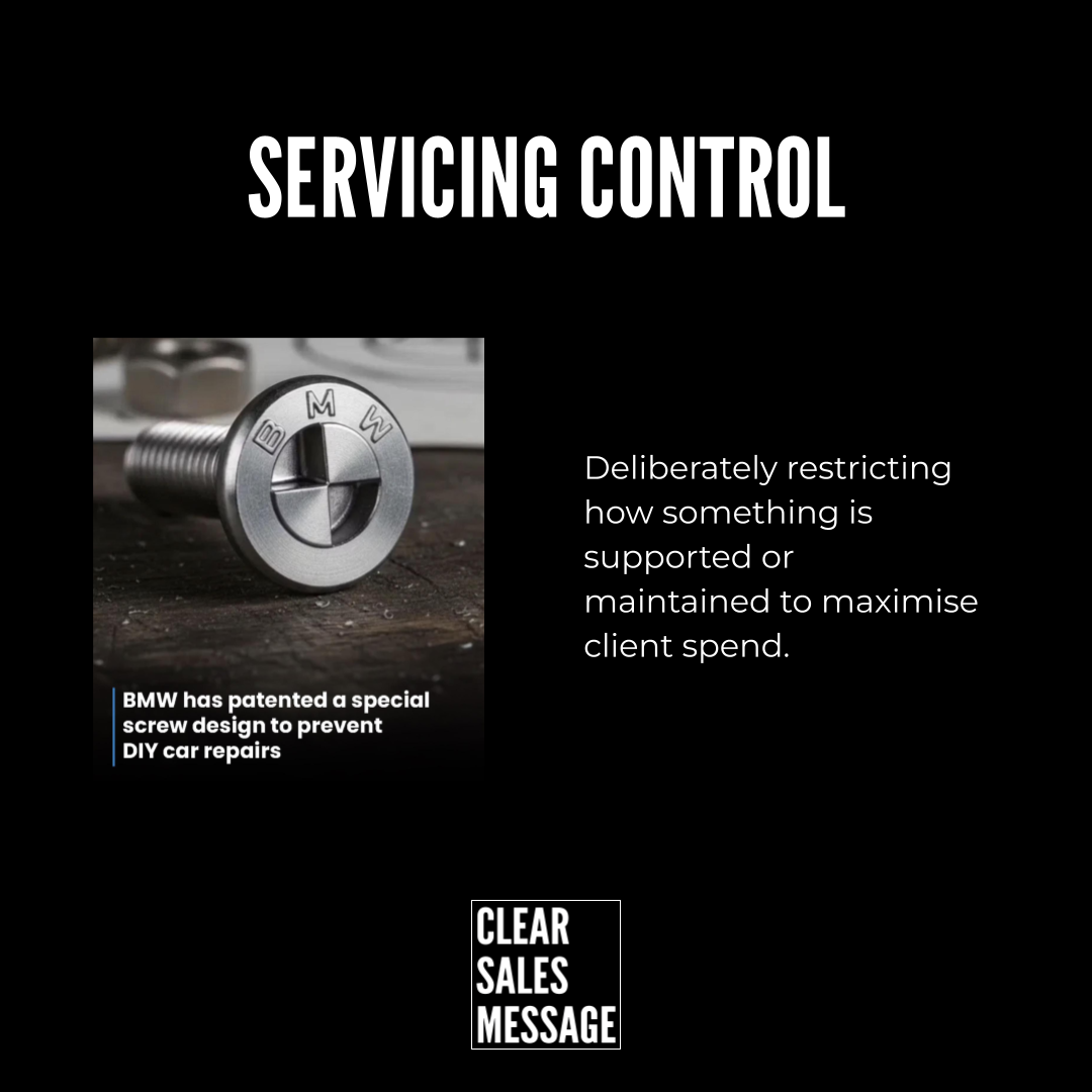 Servicing Control is the deliberate restriction of how a product or service is supported, repaired, or maintained, so that ongoing value flows back to the original provider rather than being handled elsewhere.