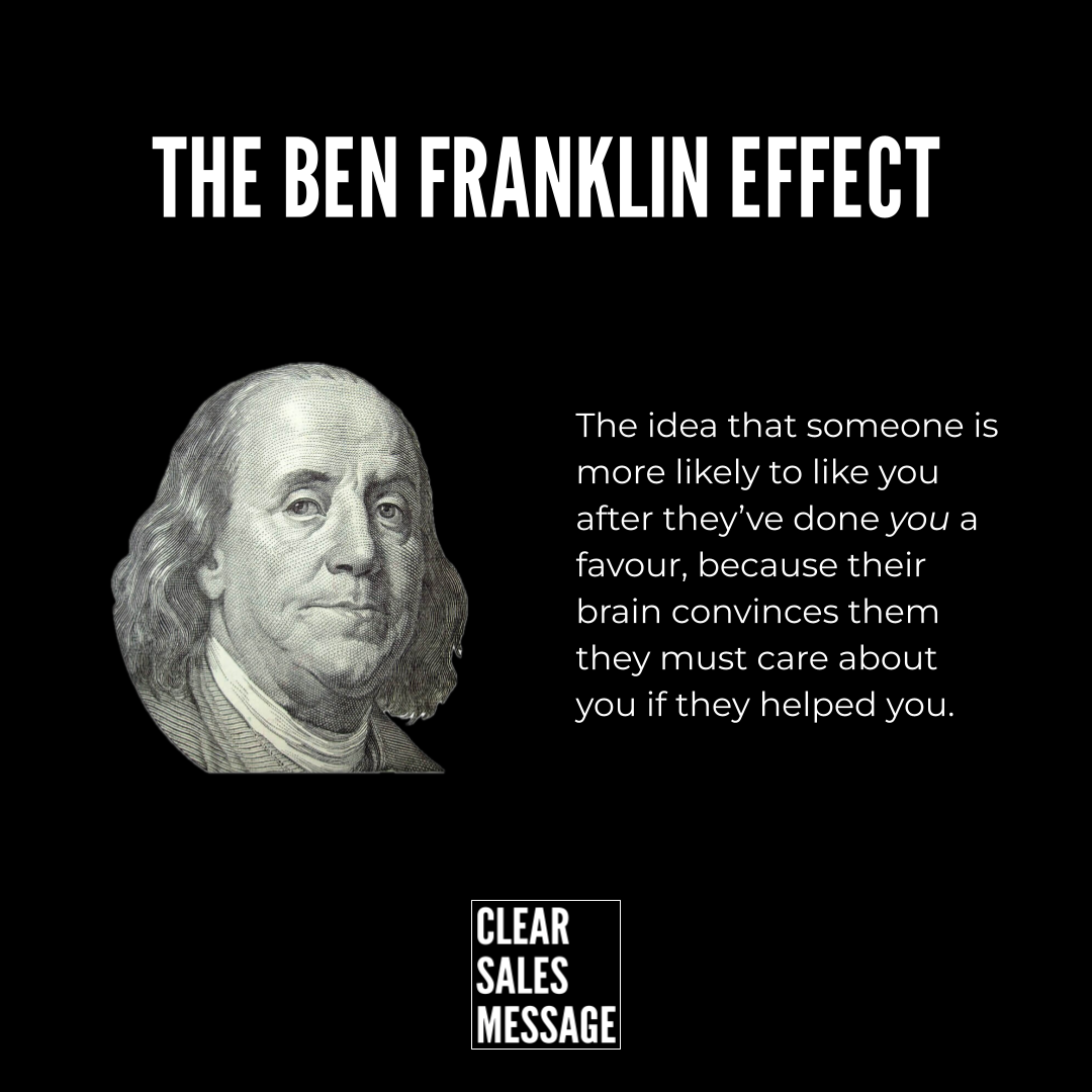 The Ben Franklin Effect is a psychological principle that says people are more likely to like you after they’ve done you a favour.