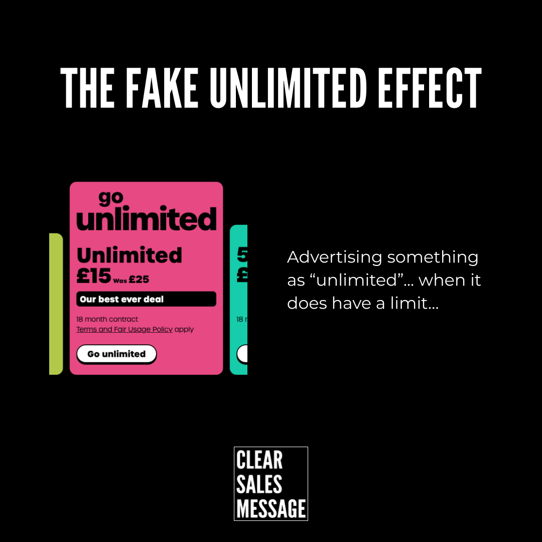 If you want to create short-term sales and long-term damage, you can do it easily by using the Fake Unlimited Effect. Just make a big “unlimited” promise, hide the limits in the small print, and hope the buyer doesn’t notice until after they’ve paid.