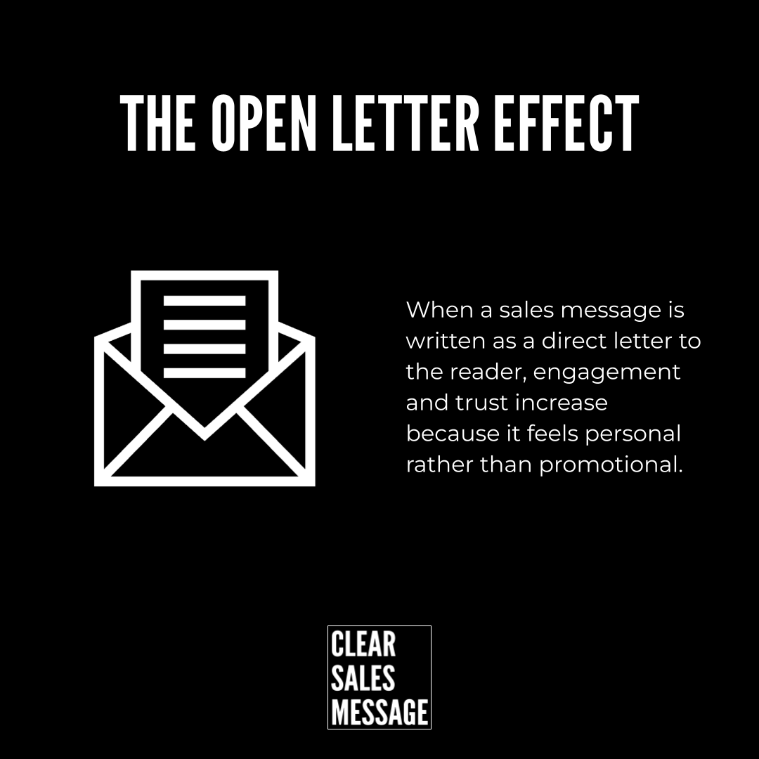 The Open Letter Effect is a messaging approach where a sales message is written as a direct letter to the reader rather than as a traditional marketing page.