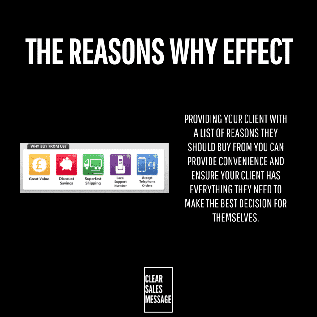 The Reasons Why Effect is all about providing your buyer with a list of the main reasons “why” they may wish to buy from you.